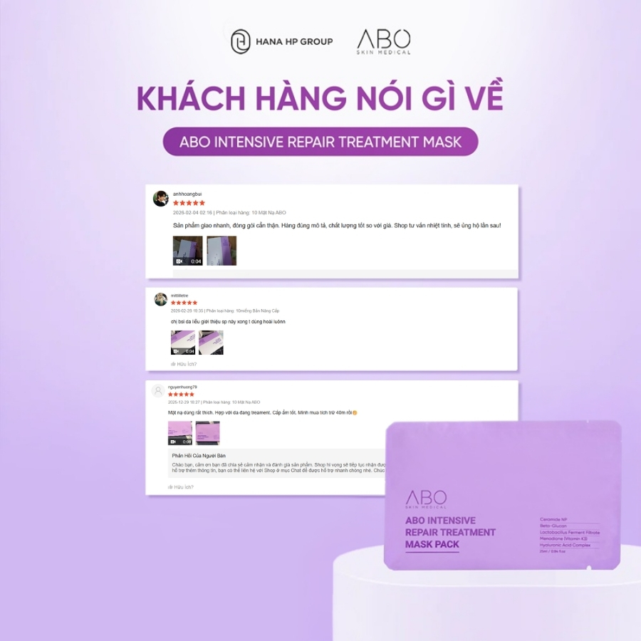 Khi làn da trở nên khô ráp, dễ đỏ, kích ứng hoặc yếu đi rõ rệt do sau điều trị, khô ráp vào mùa đông, kích ứng… đó là lúc hàng rào bảo vệ da suy giảm, khiến da mất nước và nhạy cảm hơn bao giờ hết. Hiểu được nỗi lo đó, ABO Intensive Repair Treatment Mask ra đời như một giải pháp dược mỹ phẩm phục hồi chuyên sâu từ Hàn Quốc, được nghiên cứu và kiểm nghiệm kỹ lưỡng cho cả những làn da nhạy cảm nhất. Sản phẩm ứng dụng công thức giàu dưỡng chất với bảng thành phần lành tính, giúp cấp ẩm đa tầng, làm dịu tức thì, tăng cường miễn dịch tự nhiên và tái tạo làn da khỏe mạnh.